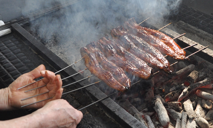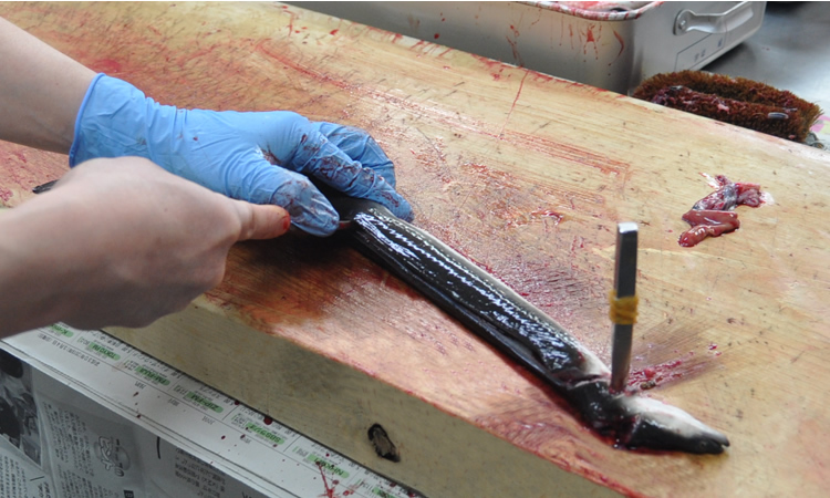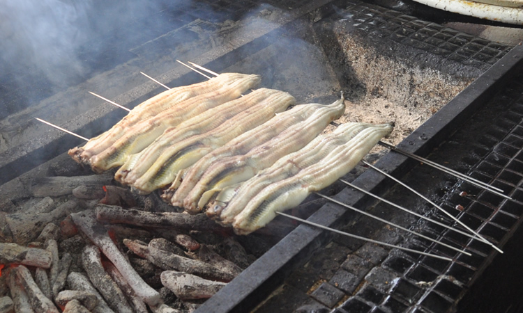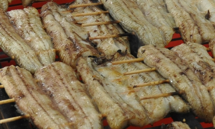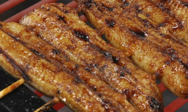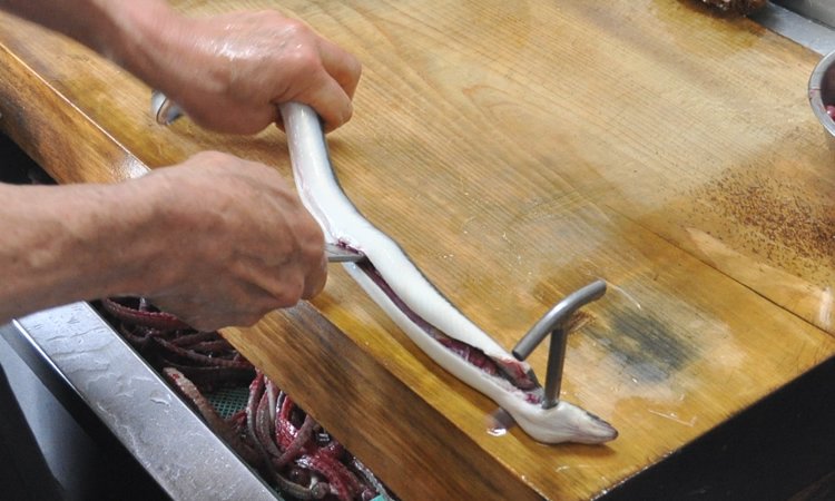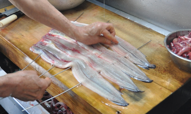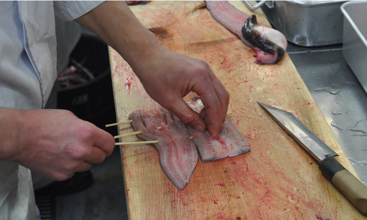 Experienced eel cooks skewer the eel like sawing carefully enough not to damage the skin.